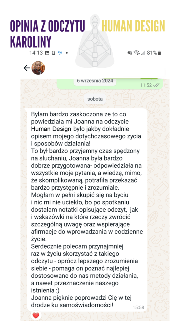 Human Design, dzięki któremu możemy zobaczyć jakie jest Twoje energetyczne DNA i przyjrzeć się Głosowi od strony energetycznej. Zobaczyć gdzie masz swoje naturalne moce i zasoby, a gdzie mogłaś zostać zaprogramowana z zewnątrz, co skutkuje wejściem w cienie i blokadami Głosu.